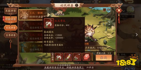 那就要说道,讨伐神兽系统了,不过日常讨伐只能获得最多三阶的橙色神兽装备。每周三和周六的跨服挑战中,百战神兽能获得红色的神兽装备,只有至尊神兽挑战才能获得金色的神兽装备。而至尊神兽每次挑战只有一个人能获取装备,获取的难度有点高,毕竟第一名只有一个。