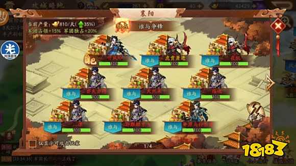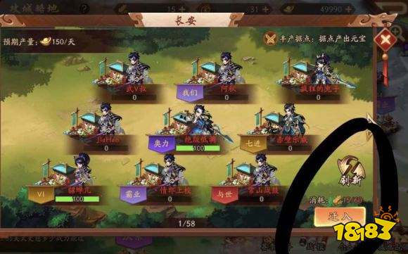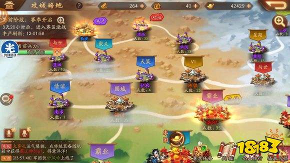 假如说你战力太低了,去哪都被人打,实在走投无路了,那么咱们可以去丰产据点,每天中午12点会刷新一个丰产据点,总共四个据点,只有一个据点可以产出元宝,咱们可以去这个据点,虽然元宝少,但总比没有强。进入攻城略地中,城池冒金光的就是丰产城池。下图可以看到总共有四个据点:长安,成都,邺城,建业,每天的丰产据点中午12点会刷新,别忘了转移城池。楼主觉得这种情况只会发生在跨服战中。