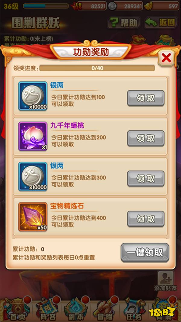 1.攻打群妖可以获得功勋值,每日功勋值累计到一定值可以领取元宝、银两、天命丹、蟠桃等丰厚奖励。随着角色等级的提升,功勋奖项数量也会增加。