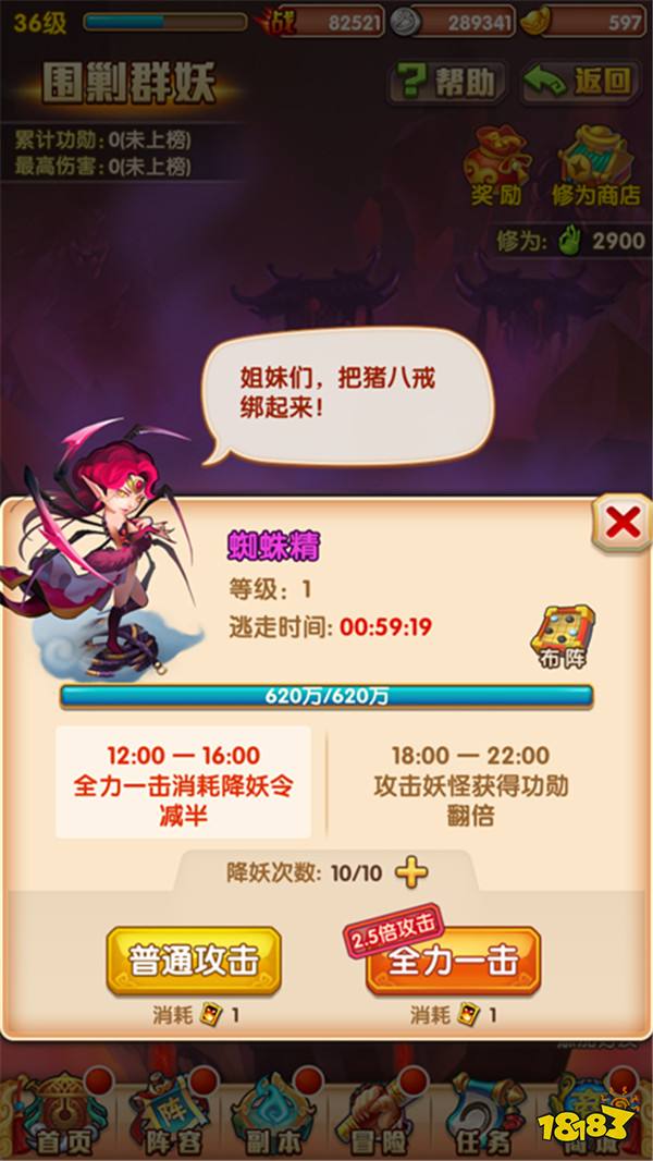 2. 每次攻打群妖需要消耗一个降妖令,玩家也可以选择消耗2个降妖令来获得2.5倍攻击。降妖令上限为10个,每1小时恢复1个。