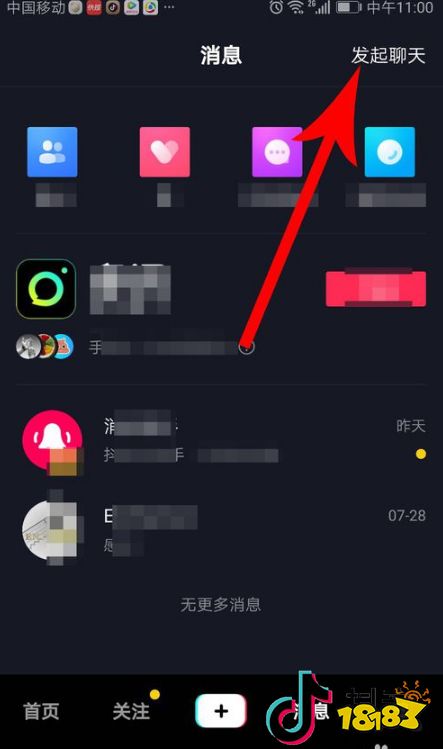 3、打开消息界面,然后点击右上角的“发起聊天”