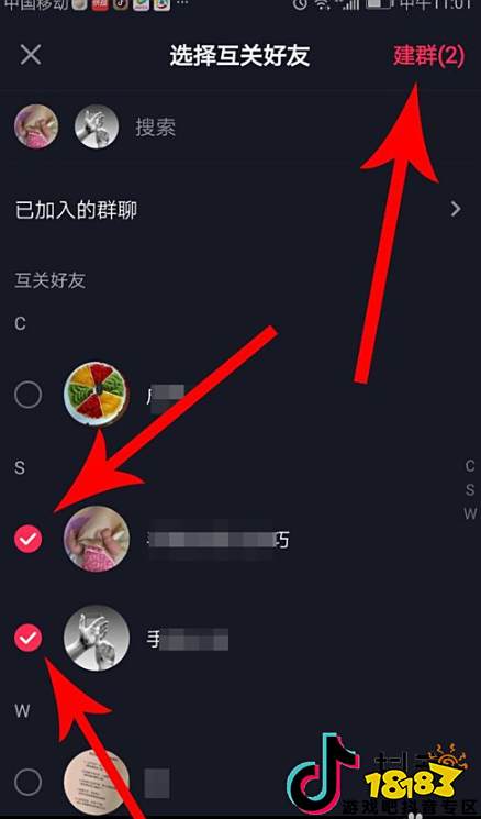 4、打开选择互关好友界面,勾选2个及以上互关好友,然后点击“建群”指令