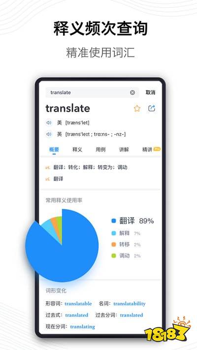 有道词典是由网易有道出品的全球首款基于搜索引擎技术的全能免费语言翻译软件。有道词典通过独创的网络释义功能,轻松囊括互联网上的流行词汇与海量例句,并完整收录《柯林斯高级英汉双解词典》、《21世纪大英汉词典》等多部权威词典数据,词库大而全,查词快且准。结合丰富的原声视频音频例句,总共覆盖3700万词条和2300万海量例句。集成中、英、日、韩、法多语种专业词典,切换语言环境,即可快速翻译所需内容,网页版有道翻译还支持中、英、日、韩、法、西、俄七种语言互译。新增的图解词典和百科功能,提供了一站式知识查询平台,能够有效帮助用户理解记忆新单词,而单词本功能更是让用户可以随时随地导入词库背单词,英语学习轻松get!!