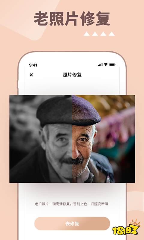 老照片修复,照片修复还原。 支持老照片修复、修复旧照、图片修复、黑白上色等的图片修复恢复、图片还原功能,可一键将模糊照片、模糊老照片实现老照片恢复上色、旧照恢复还原、视频截图还原。
