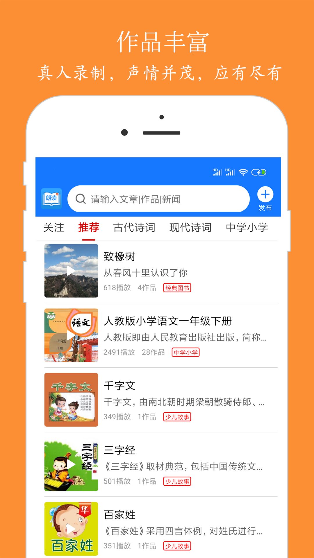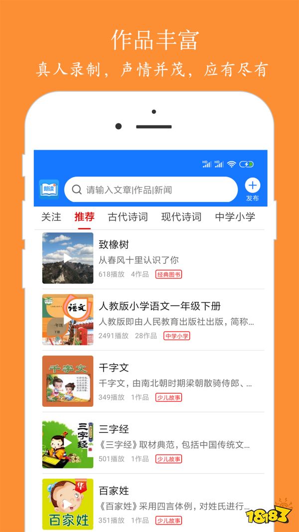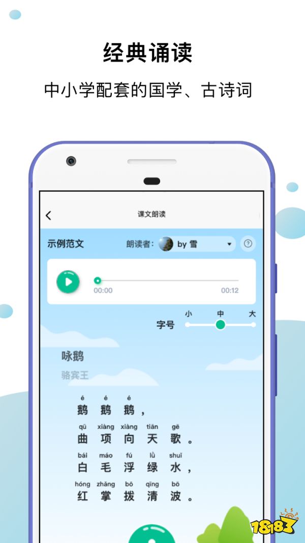 软件汇集了许多语文课文,朗读国文素材,涉及到古诗词、国学、四书五经等,提供了学生朗读智能打分和点评、学习统计报告、智力闯关等。