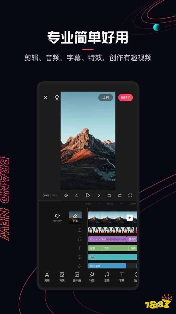【剪映】 全能好用的视频编辑工具,轻松剪出美好生活。 【简单好用】一键剪切视频,节奏快慢自由掌控,感受时光倒流。 【贴纸文本】独家设计手绘贴纸,多种风格字体随心选,给你的视频加点乐趣。