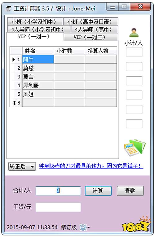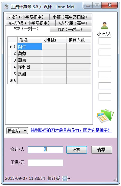 工资计算器是一款专门为培训机构教师准备的计算器,以小时计算和人数计算工资的计算器,适合大多数培训机构的课时费计算以及社保的计算。