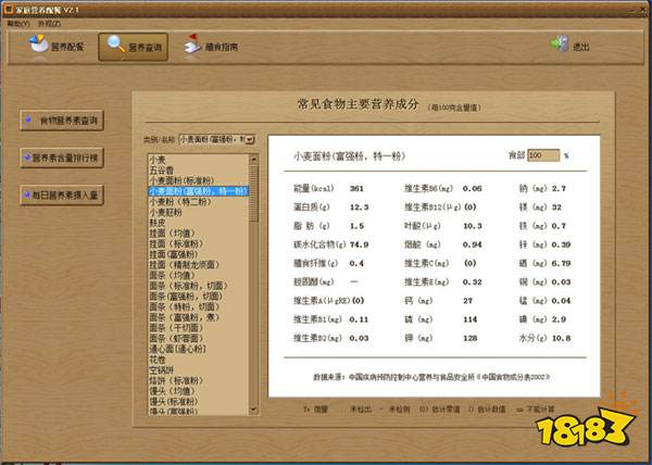 本软件由“营养配餐”、“营养查询”和“膳食指南”三大功能组成,其中营养配餐的操作非常简单:先用鼠标选择食物,再点击“配餐”按钮,即可配出即符合自己口味,又能达到平衡膳食要求的三餐食谱。