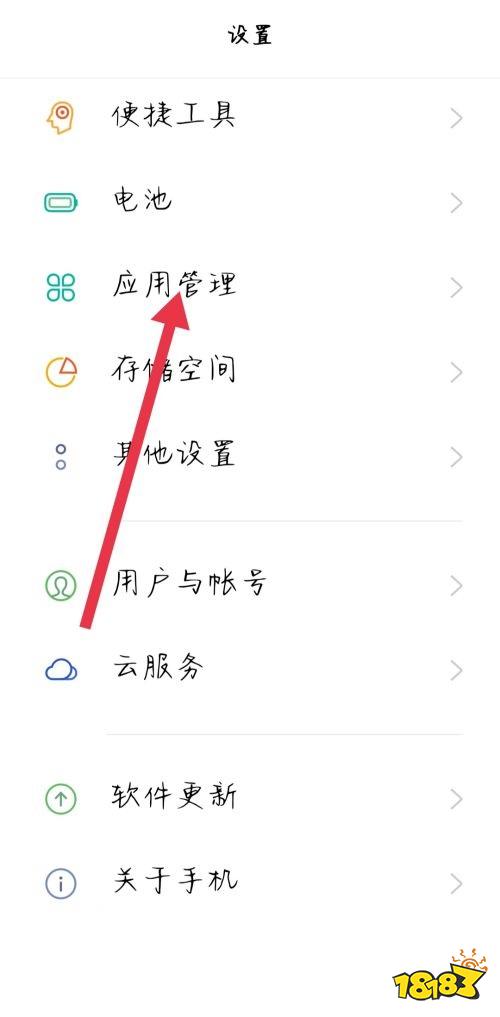 1、首先打开手机自带的“设置”,在列表中找到“应用管理”。
