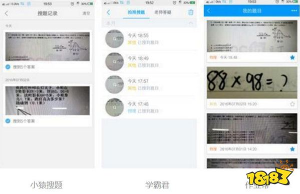 页面布局:在搜索记录中,作业帮和小猿搜题采用的界面布局相同,图片较大,可以看清部分内容,方便搜索题目,但其缺点是一瓶显示的题目个数较少,学霸君采用列表式,一屏显示的内容较多,但看不到具体内容,不便于寻找题目。