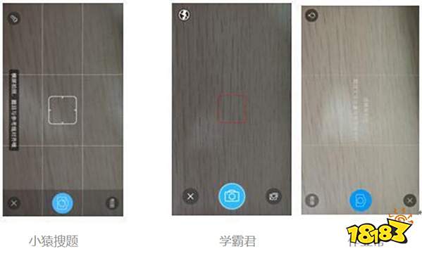 三者界面布局和信息内容都相似,都有拍照按钮、退出、相册以及闪光灯,作业帮和小猿搜题的相册使用汉字,并且拍照时有参考线,而学霸君没有参考线,相册使用图标表示,并且选取图标符合人的认知行为习惯;至于相册和退出的位置可以用人眼轨迹图进行测试,然后再选择放置位置;对于拍照聚焦方面,如果聚焦内容中没有明显的字母、数字或者字符,学霸君和作业帮都会提醒无法聚焦,提高搜题的成功率,而小猿搜题没有此类提醒。