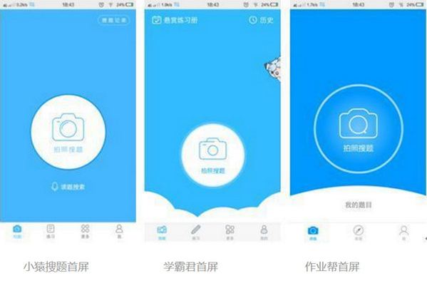 三者首屏界面布局和整体颜色都基本相同,作业帮中包括拍照搜题,语音搜索和搜索记录,语音搜索较为新颖;学霸君包含拍照搜题和历史,拍照搜题标志较小,其历史与作业帮中的搜索记录位置相同,都置于屏幕右上方;小猿搜题包括拍照搜题和我的题目,拍照搜题按钮十分显著,并且做以微动效,吸引用户点击搜题,增加趣味感和新鲜感,我的题目置于拍照搜题下方,背景以白色区分,更加清晰明确。