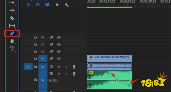 6.当然,音乐突然停止,肯定看视频的人听起来也不舒服,所以我们需要用钢笔工具,在音频轨道加几个锚点,使音乐缓慢结束。