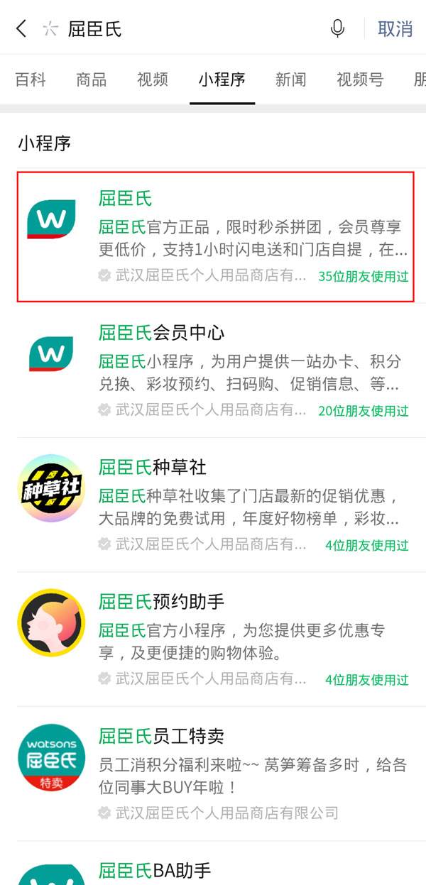 1、首先打开微信,搜索并登录屈臣氏小程序。