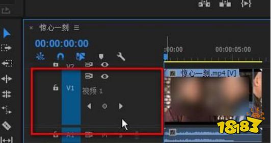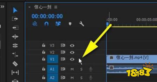2.鼠标放在视频轨道1,显示眼睛图标这个位置上,如下图箭头指向所示: