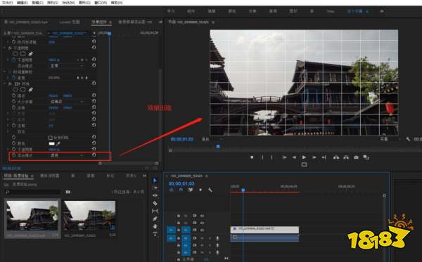 打开视频素材的效果控件窗口,找到网格效果设置,来设置网格效果的混合模式,将其混合模式改为“滤色”。一个视频画面被划分为一个个方格的画面效果就完成啦。