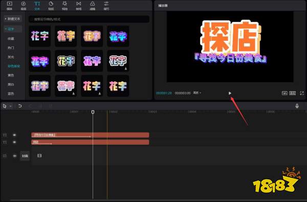 点击彩色渐变按钮,选择一种花字,将其添加到文本轨道中,更改文本内容为"『寻找今日份美食』",见下图。