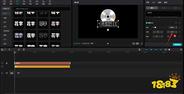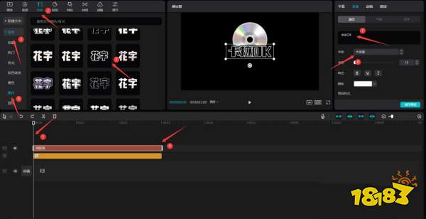 将时间轴移动到0秒处,点击文本按钮,选择黑白花字中的一种,将其添加到文本轨道中,更改文本内容为"卡拉OK",字体为大字报,见下图。