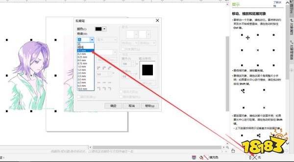 图3:将图片生成的轮廓图用鼠标拖动出来18183小编然后就又双击右下角的“轮廓笔”,设置轮廓线的宽度为“细线”。