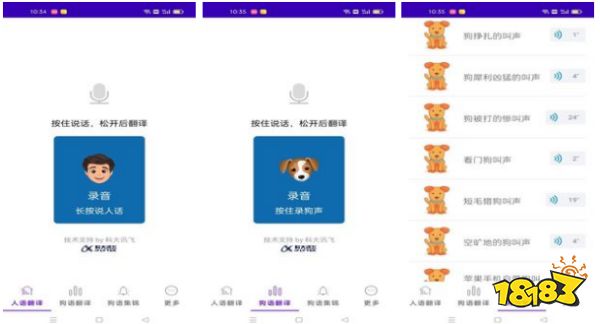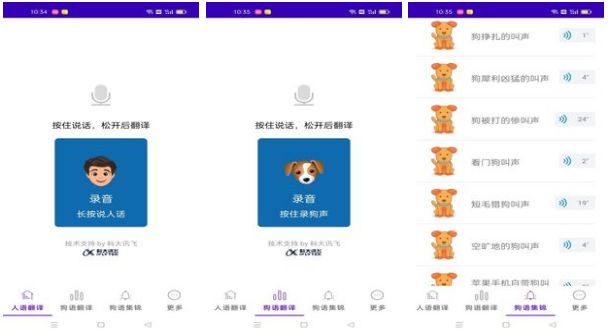 人狗语言一键翻译器,一键将人对狗的指令翻译成关键语言;通过声音翻译成人类语音来收集狗的声音;各种狗语言表达的翻译和知识库
