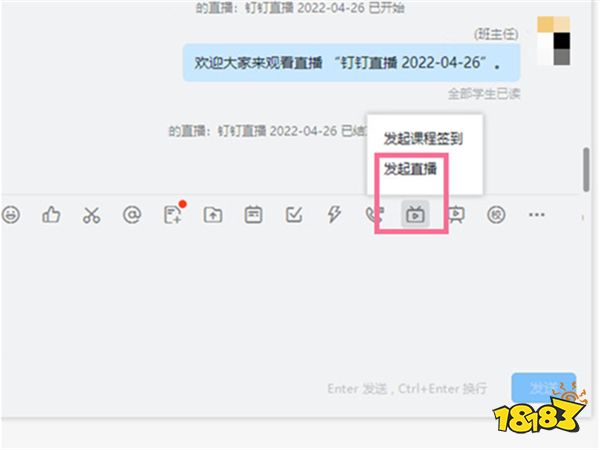 1、打开钉钉聊天对话框,点击直播图标,选择【开始直播】。