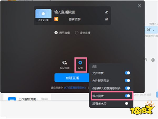 2、点击设置,开启【保存回放】后再创建直播即可。