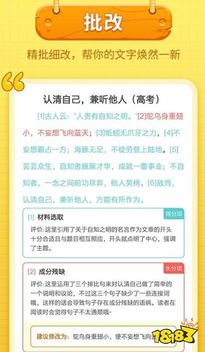 在这款app内什么样的作文都有,有满分的优秀作文,同时也有零分的作文,零分不是因为不认真,而是因为跑题、不审题,帮助学生纠正这些问题,找到根本的修改方法。