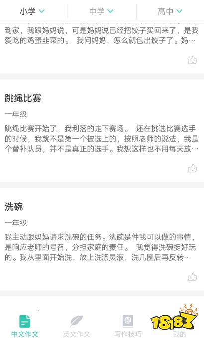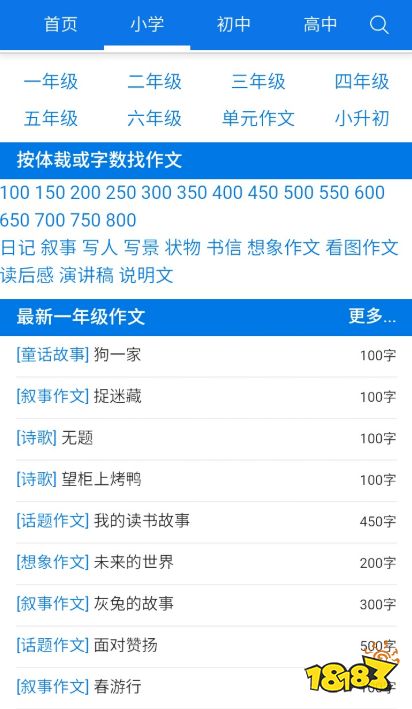 App里有小学、初中、高中三阶段的作文,且全年级根据字数、写作手法来进行搜索,不论是短篇还是长篇,各种满分作文进行分享。