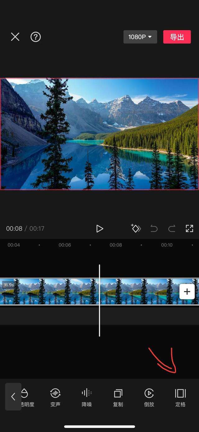 点击视频条,把下方的功能栏拖到最右侧,然后你就能看到最右边有个定格的选项