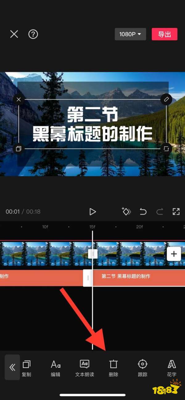 然后两根手指向外拉,把视频条放大,把分割线调到0.5秒定格的位置,点击设置好的字体条,点击分割,删除右边多余的字体条