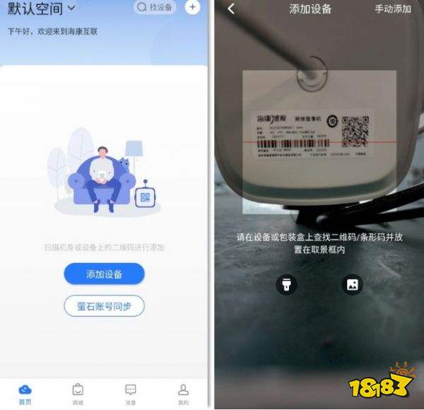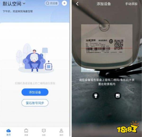 海康互联app支持通过扫描二维码/条形码添加设备。