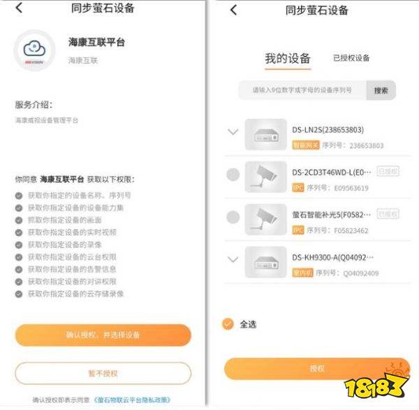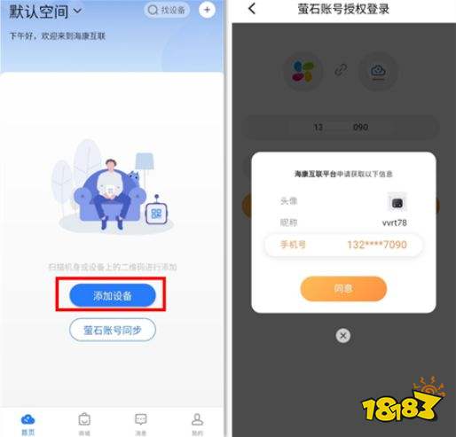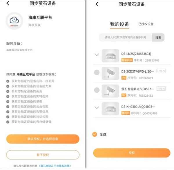 在APP首页点击“萤石账号同步”,同意海康互联平台获取萤石账号信息及相关权限,选择授权的设备即可完成同步。