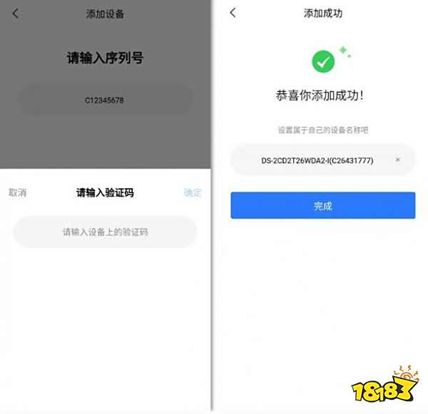 在APP首页点击“添加设备”,在扫描添加设备界面右上角点击“手动添加”输入设备序列号及验证码,即可成功添加设备并修改设备名称。