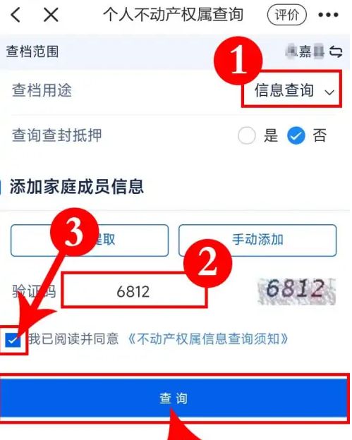 我们在个人不动产权属查询页面里,在档用途标记1处,选择项目。在验证码标记2处,输入验证码。在我已阅读并同意前标记3处,点击勾选。在下方红色箭头方框4处,点击“查询”按钮。【下方如图所示】