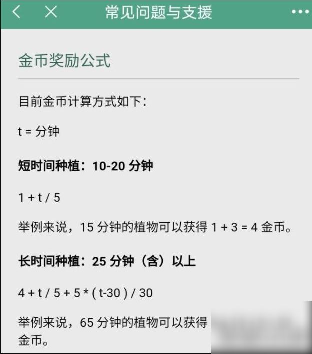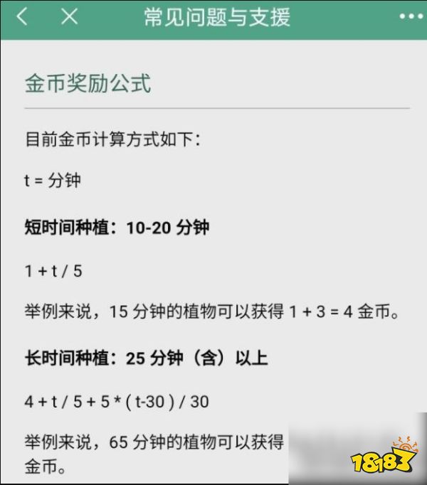 金币奖励公式分为短时间种植和长时间种植,玩家要获得大量金币就需要完成25分钟以上的长时间种植,而短时间种植则提供的金币较少,10分钟以下则不提供金币。