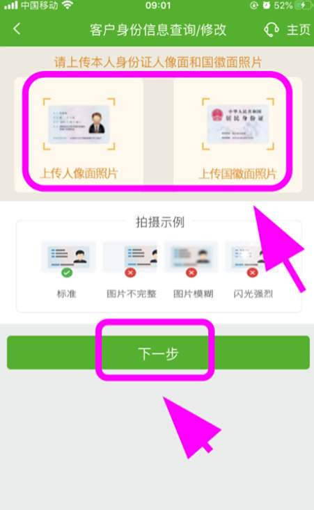 6、跳转身份信息页面,拍摄上传【现有身份证信息】,点击【下一步】,审核通过,完成。