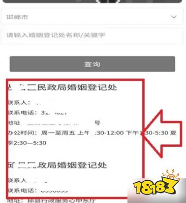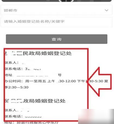 点击【查询】之后,该地区所有的婚姻登记处的详细地址,名称,联系人等信息就全部显示。