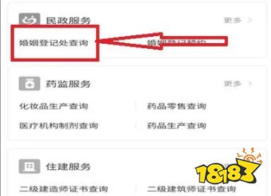 进入到【河北政务服务】,向下拖动,找到【民政服务】,然后点击下方的【婚姻登记处查询】。