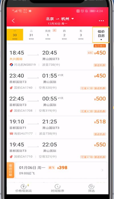 4、点击右上角的低价日历,在这里即可选择在*低价的日期购买机票