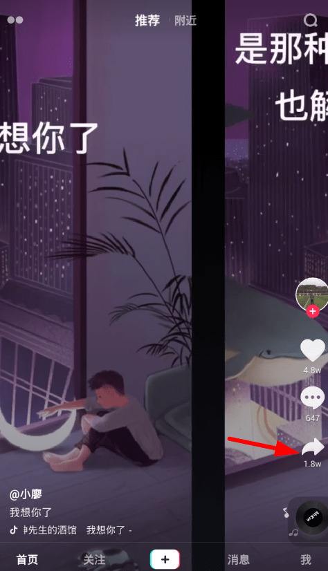 抖音分屏怎么弄1、大家要是想分屏录制视频,那就需要先搜索找到自己想添加进行分屏录制的视频,然后点击该视频右侧的分享选项。