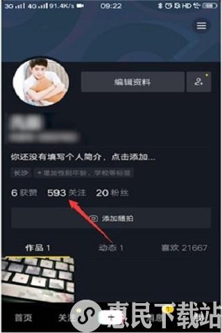 2、进入到抖音的个人主页后在账号信息里找到“关注”并点击,如下图。
