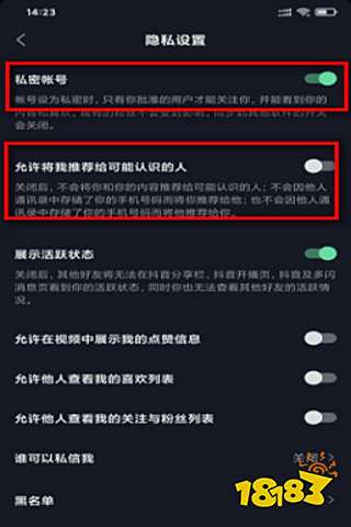 4、进入到隐私设置界面之后,找到“私密账号”打开后面的按钮,并关闭“允许将我推荐给可能认识的人”即可,如下图。