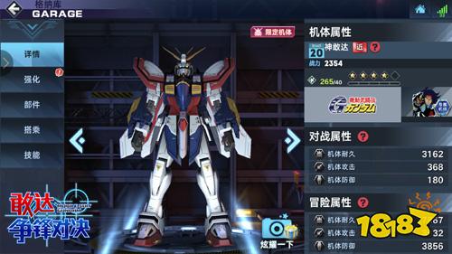 G高达为9月限定蛋池中的机体,配信时间有限大家还要抓紧。该机初始就为三星,从三围来看,属于典型的攻高防低的类型。不过该机机动性极强,并且是地走类型。总计有个模式,初始形态和打开被动技能“明镜止水”后的究极模式。两模式必杀为一样,但是其他招式变化较多,把玩起来乐趣颇多。 3星01级:血量1898、攻击220、防御115 3星20级:血量2563、攻击286、防御149 4星20级: 血量3162、攻击368、防御180