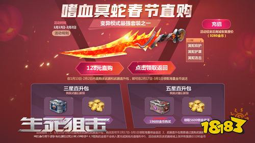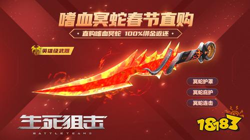 手游首款英雄级套装-“冥蛇”中率先登场的英雄级武器,将与其他冥蛇武器组成游戏中变异模式当前最强的套装。在1月13日至2月2日期间,游戏将会开启超值嗜血冥蛇春节直购活动:玩家通过128元直购的方式获取武器,购买后还将额外返还1280绑金;而在购买三星及五星升阶包后,玩家也可领取海量的绑金返还福利,绑金返还福利可于2月17日至3月1日期间领取。