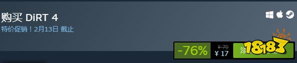 《尘埃4》优惠现售17元,原价70,历史最低价。7558篇测评中78%好评率,多半好评。不支持简体中文,特惠活动截止至2月13日。