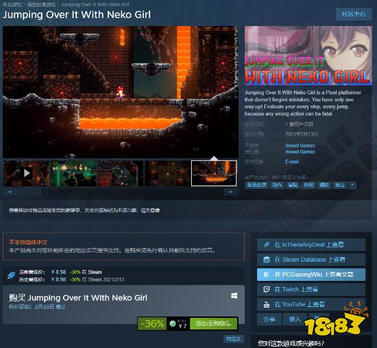高难度像素风横版平台跳跃游戏《和猫娘一起跃过难关》在Steam开售。