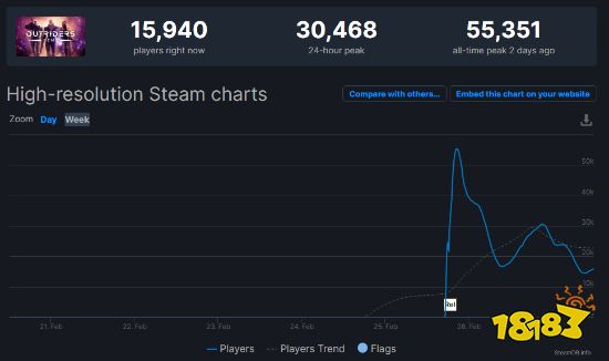 据SteamDB数据显示,SE的《先驱者》Demo已经登上Steam热门游戏排行榜第一位,目前有上万名玩家正在游玩,玩家最多时高达5.5万人次。本作24小时内有超过3万名玩家进行过游戏,自发售的2日内有超过5.5万人游玩过本作Demo。