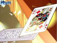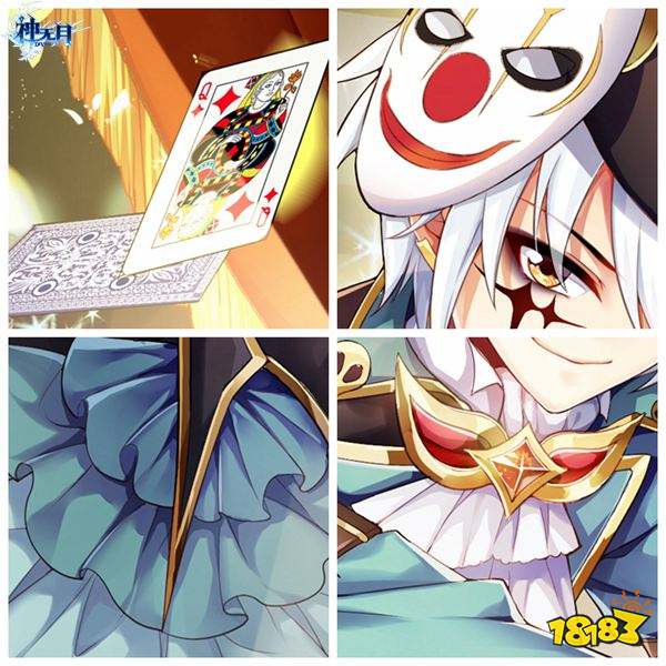 一张邪魅狂狷的脸谱,盖住一头的银发。冷峻的眼眸中射出星星般的光芒,刀疤状的眼妆神秘又另类,闪耀的蝴蝶结扣拴住一身靛蓝色晚礼服。纷飞的扑克散落周围,显示出了施展魔术者的高超技艺。让人不禁想要看看这位魔术师的全貌。