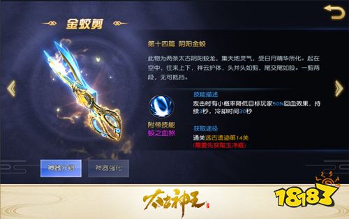 想要获得混沌神器的认可,玩家首先要通过试炼证明自己的实力。现在游戏内已经完成神器任务“远古遗迹·十三”并解锁了神器“玉净瓶”的玩家将接到名为“远古遗迹·十四”的新任务,完成任务即可解锁新神器“金蛟剪”。
