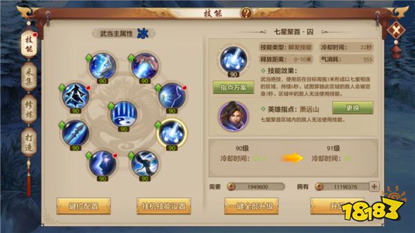 七星聚首的定身时间在玄慈指点后,可以提升到6秒钟,在经脉和暗器技能禁行加成后,可以将定身时间提升至10秒。如果敌人的珍兽没有驱散技能,那么在与近战门派PK时,七星一定很好用(游刃有余刷新)。但是对付远程门派时,定身时间增加效果比较一般,不如定身时受到伤害增加的暗器技能严刑技能。严刑可以让武当少侠对定身目标伤害最多提高30%!这个效果在与峨嵋PK时非常好用。